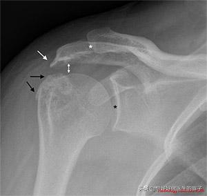 Schulterschmerzen aufgrund eines Impingement-Syndroms der Hüfte sind gekennzeichnet durchSchmerzen, die mit der Bewegung des Schultergelenks verbunden sind (zu unterscheiden von Schmerzen der Halswirbelsäule, die Schulterschmerzen verursachen)In einigen Fällen können die Schmerzen durch bestimmte Hebe- oder Abduktionsbewegungen der oberen Gliedmaßen ausgelöst werden, und bei einigen Patienten ist ein Klicken in der Schulter zu hören, wenn der Schmerz ausgelöst wird. In diesem Fall kann das Vorhandensein eines Problems oft durch eine Röntgenaufnahme oder eine MRT des Schultergelenks festgestellt werden.Wie Sie unten sehen können, ist der weiße Pfeil der Osteophyt des Akromions, der durch das Impingement entsteht, und der schwarze Pfeil stellt den Osteophyt des Tuberculum majus des Humerus dar, der auf das Akromion drückt.(ebd.).