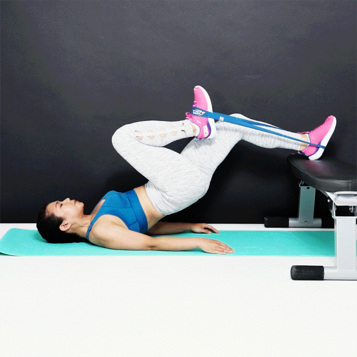 - Beinheben mit Elastikband für die Gesäßbrücke: 10-12 Wiederholungen pro Satz.