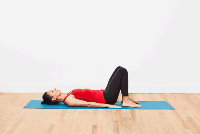 - Heben Sie beim Ausatmen die Hüften an. Spannen Sie die Gesäßmuskeln an und halten Sie 3 Sätze lang die Luft an.