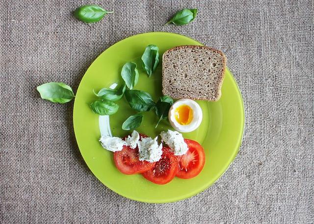 Frühstück: Tomate und Ei auf Vollkornbrot, Tomate und Gurke mit ungesüßtem Joghurt.