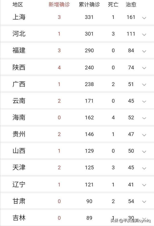 Guangdong, Zhejiang, Hunan, Jiangxi, Jiangsu, Chongqing, Shandong, Peking, Shanghai, Hebei, Fujian, Shaanxi, Guangxi, Yunnan, Guizhou, Shanxi, Tianjin, Liaoning, Innere Mongolei, Xinjiang, insgesamt 21 Provinzen und Gemeinden haben nur wenige neue bestätigte Fälle, davon fünf Provinzen und Gemeinden mit nur einem neuen bestätigten Fall.