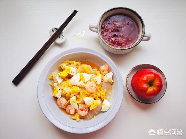 Abendessen: 250 g gemischter Getreidebrei + 100 g Apfel + Ei mit Kohl und Krabben, 320 kcal, mit einem ausgewogenen Verhältnis der drei wichtigsten Nährstoffe.