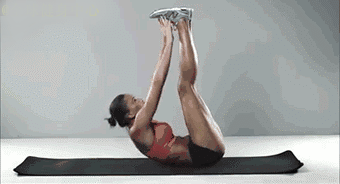 Legen Sie sich flach auf dem Boden auf einer Yoga-Matte. Danach Kopf, Hals, Beine zusammen, leicht vom Boden abheben lassen, aber nicht den Rücken beugen, die Knie zur Brust beugen, mit dem Oberkörper nach vorne gehen und die Knöchel berühren.