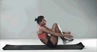 - Setzen Sie sich hin, spannen Sie den Bauch an, halten Sie den Rücken gerade, beugen Sie die Knie und heben Sie die Beine, haken Sie die Zehen ein.