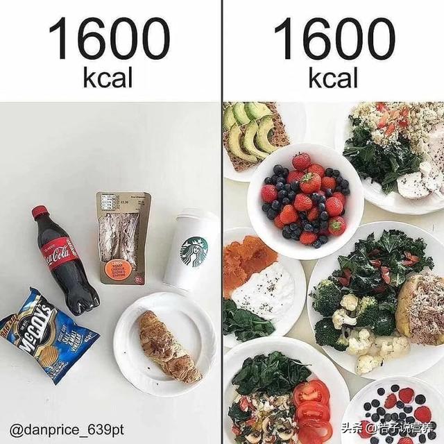 Wie Sie auch aus dem Vergleich unten ersehen können, gibt es einen großen Unterschied bei der Größe und dem Gewicht der Lebensmittel für die gleichen 1600 kcal. Die Lebensmittel auf der linken Seite können mit einem Mittagessen verzehrt werden, während die Lebensmittel auf der rechten Seite den ganzen Tag über gegessen werden müssen.